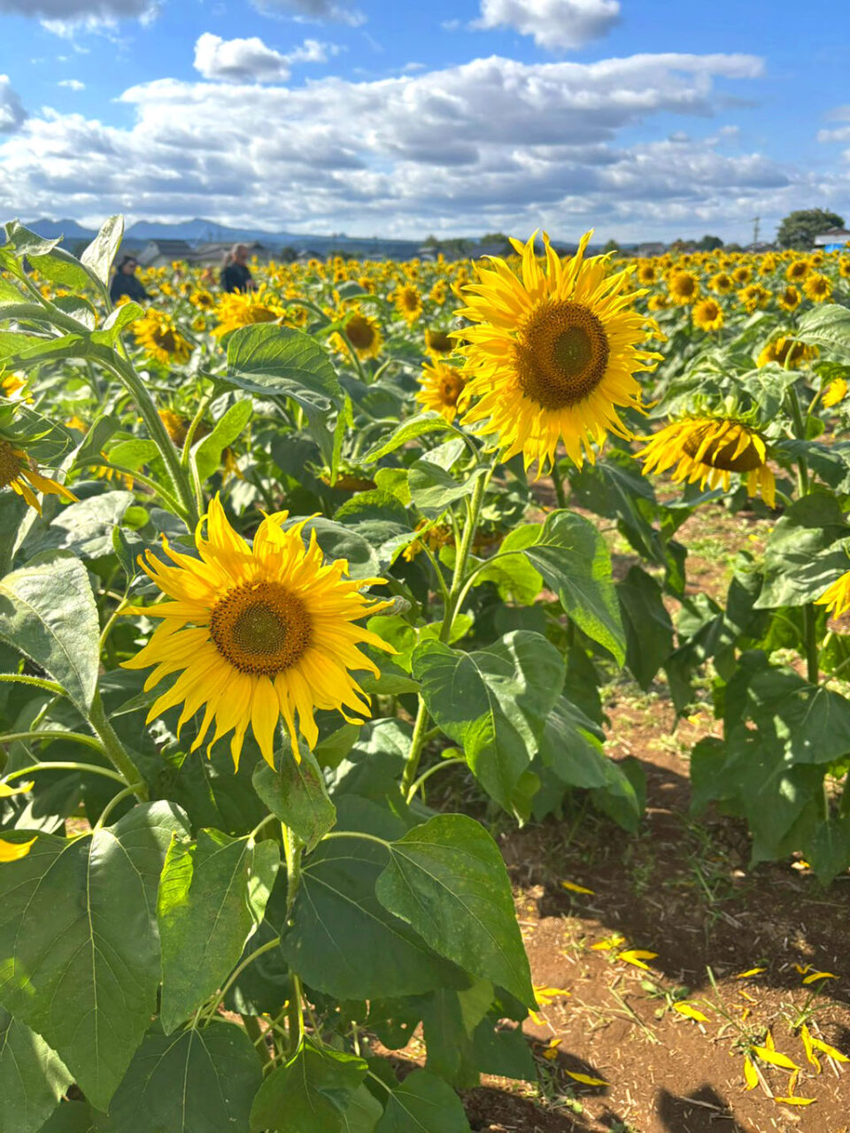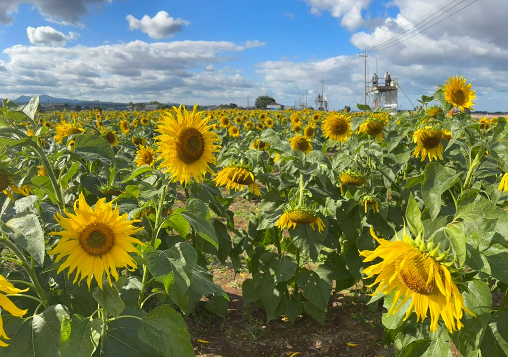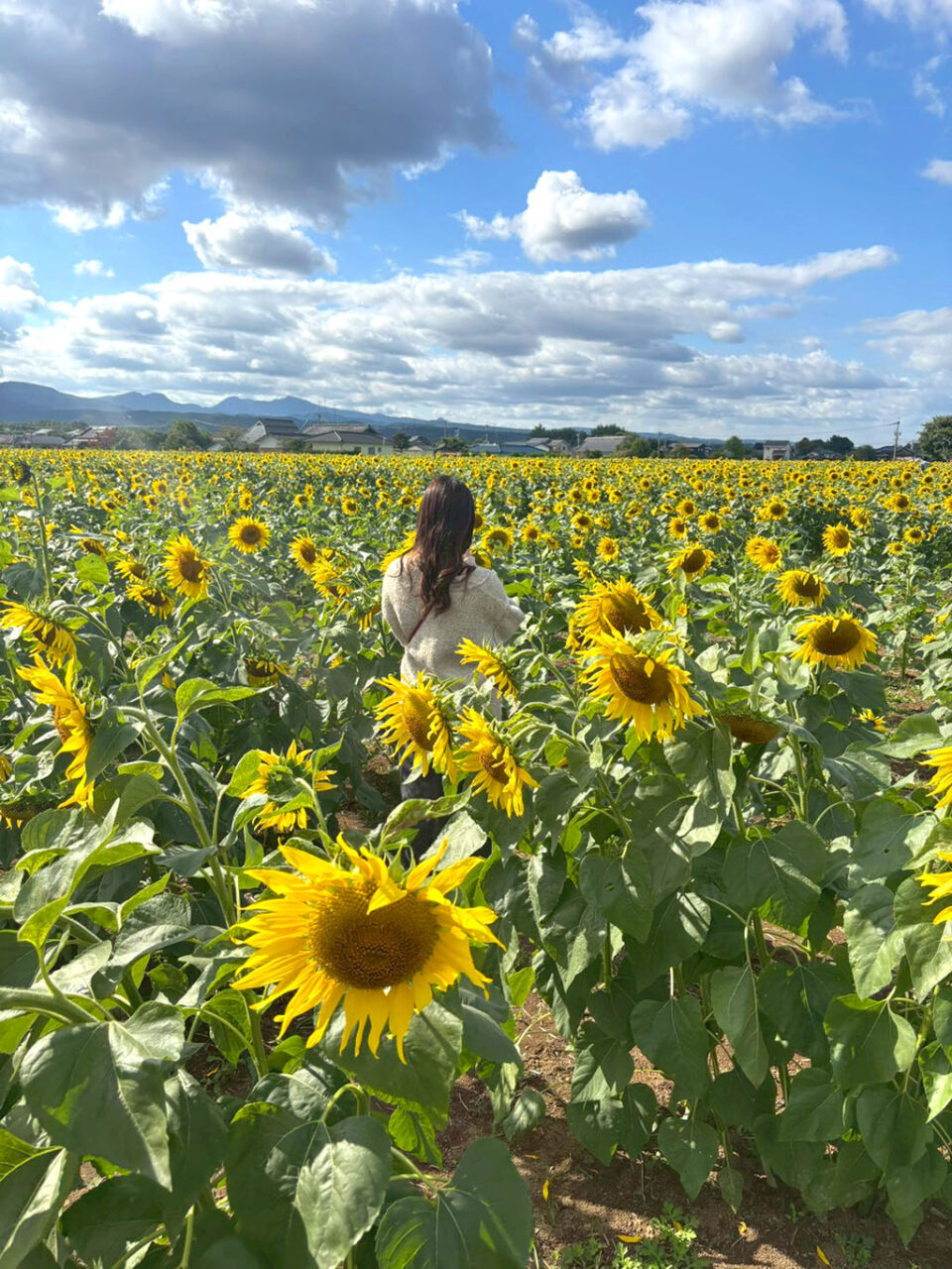 コスモスのやわらかな色合いと、鮮やかなひまわりの黄色が織りなす風景は、まるで映画のワンシーンのよう。作品の世界観を感じながら散策や撮影を楽しむことができます。