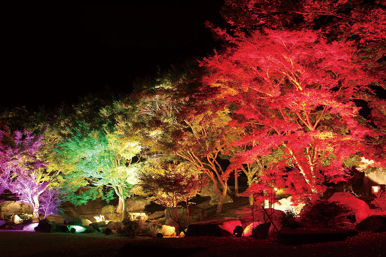 耶馬渓ダムの完成記念に造られた「溪石園」。50種2万本以上の樹木に池、岩、滝などが四季折々に、見事な調和を見せる公園をライトアップします。