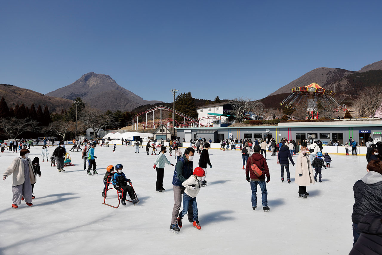 由布岳と鶴見岳の麓に広がるタテ30m×ヨコ60mの九州最大級の屋外アイススケートリンク!雄大な景色と風を感じながら滑ろう!