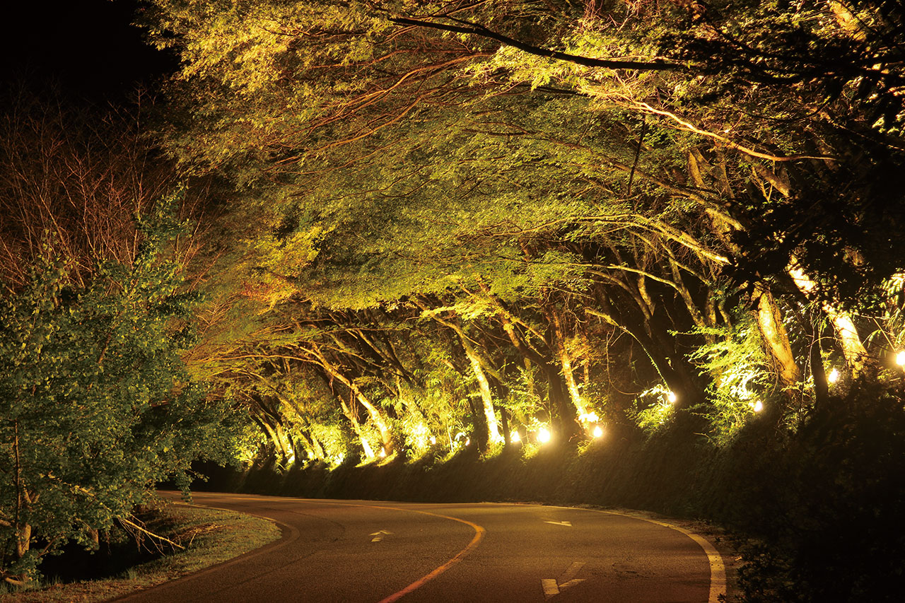 深耶馬溪公共駐車場付近約100mにわたる「ひさしもみじ」の並木が、ライトアップにより美しく浮かび上がります。