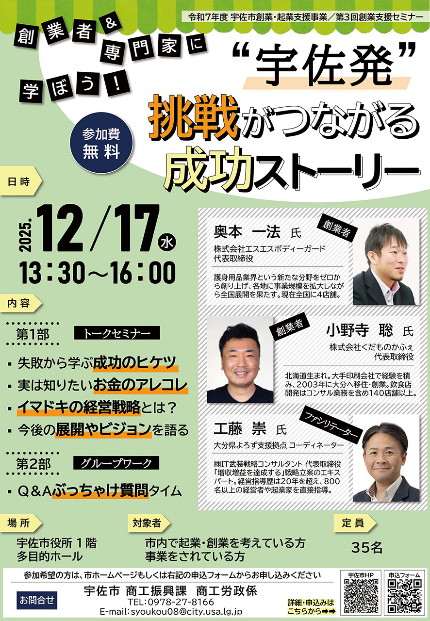 創業者や経営の専門家によるトークセミナーを開催します。宇佐市で成功した方の話を聞いてみませんか。創業に関するノウハウや質問にもお答えします。市HPの申込フォームからお申し込みください。