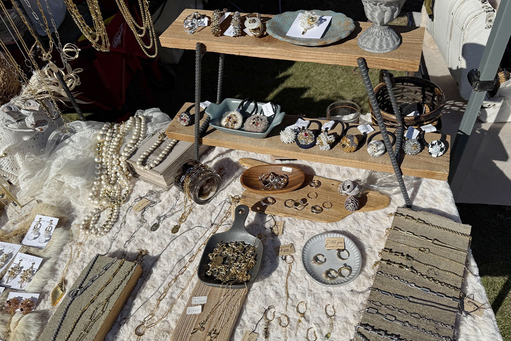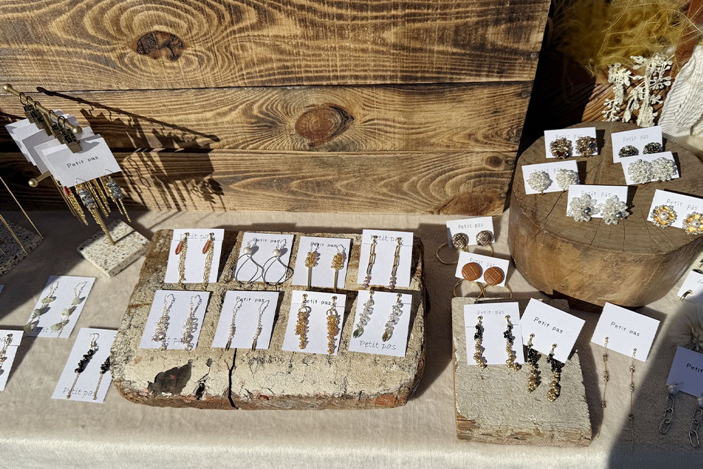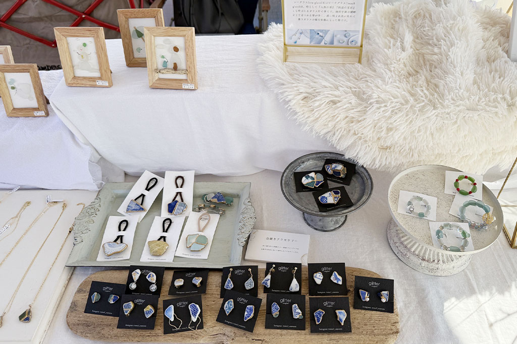 シーグラス作家さん。波に揉まれたシーグラスの「奇跡・出会い・絆・生命力」という石言葉を大切にしながら、アクセサリーや作品を制作されています。やさしい色合いと風合いが魅力で、癒しを感じるアイテムが並んでいました。
