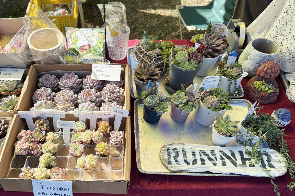 多肉植物を中心に制作する植物雑貨クリエイターさん。植物のツル(ランナー)の生命力に感動したことから屋号を名付けたとのこと。イベントを中心に活動し、季節の植物雑貨など魅力ある作品を展開しています。