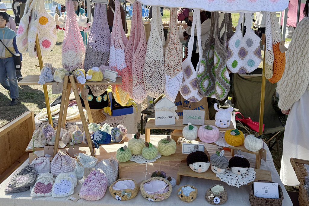 かぎ針編みの雑貨を制作。小物入れやモチーフ編みのアイテムなど、やわらかな風合いの手づくり作品が揃います。普段使いしやすい落ち着いたデザインが印象的でした。