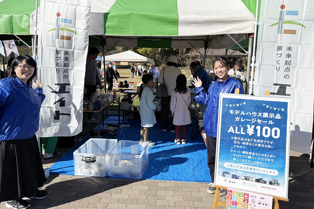 モデルハウス展示品を活用したガレージセールを実施。すべて100円と手に取りやすく、暮らしのアイテムを無駄にせず循環させる取り組みが行われていました。