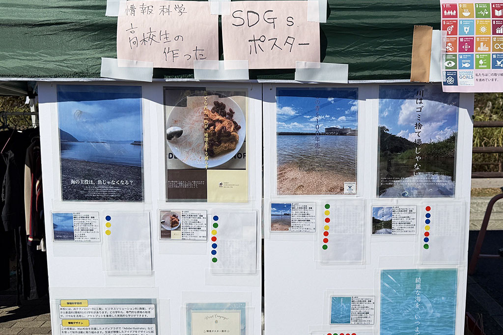 居場所づくりのバザーや環境ポスターの展示を実施。高校生が制作したSDGsポスターも多数掲示され、人気投票も行われるなど、地域の取り組みを知るきっかけとなる内容でした。