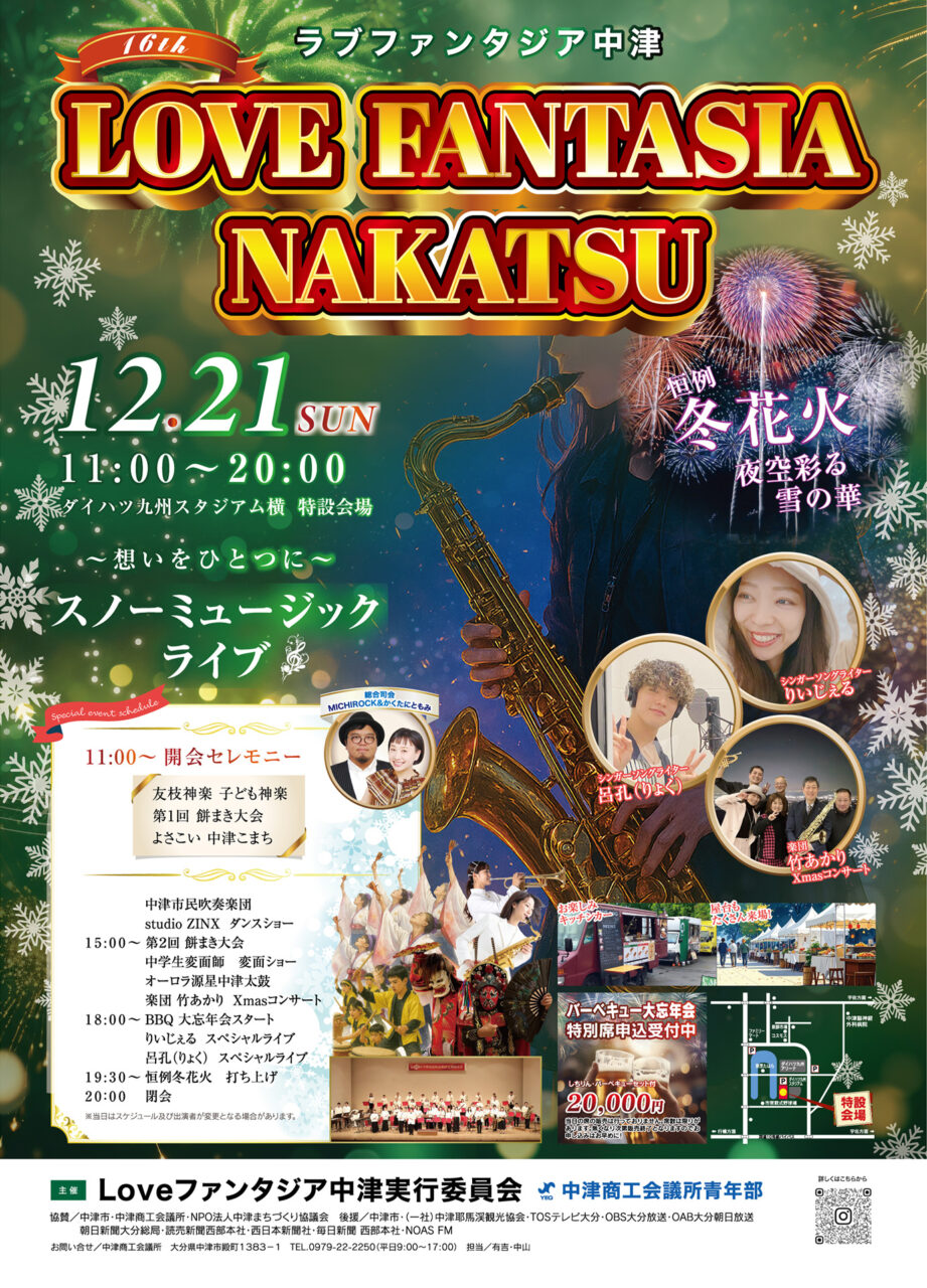 さらに、12月21日(日)にはダイハツ九州スタジアム横の特設会場にて、花火やステージイベントを中心としたワンデイイベントが行われます。昼から夜まで続く多彩な催しとともに、冬の中津ならではのひとときを楽しめる一日となっています。