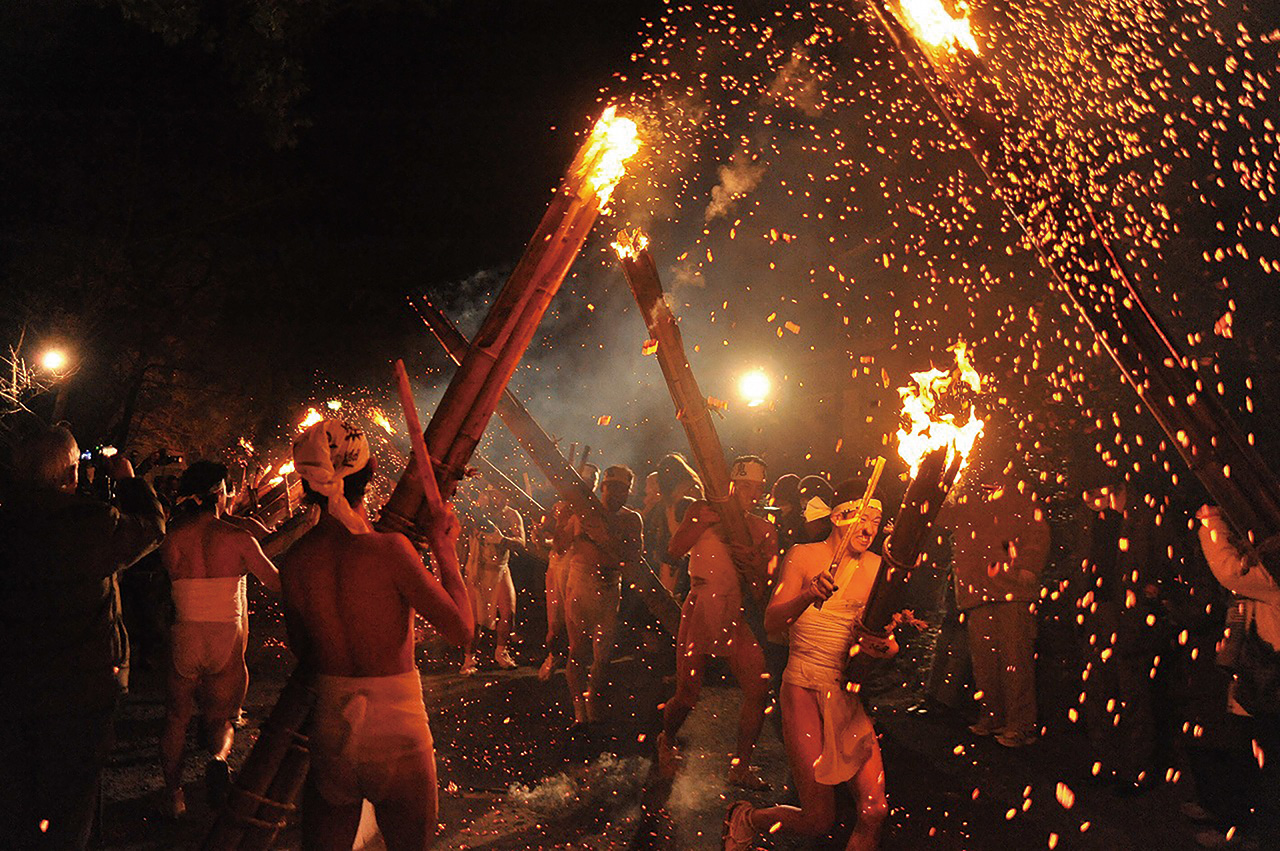 1,300年余りの歴史を持つ伝統行事、鷹栖観音の「鬼会」は、締め込み姿で約2メートルの松明を掲げて厳寒の駅館川を渡り、高さ約10mのドンドに火をつけた後、松明を打ち合う勇壮な“水と火の祭り”で、1年の無病息災と五穀豊穣を祈願します。