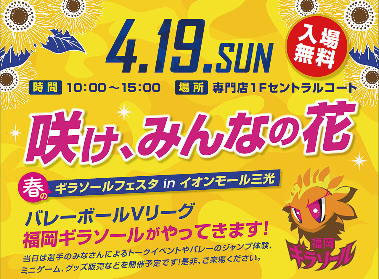 〈イオンモール三光〉 咲け、みんなの花春のギラソールフェスタinイオンモール三光バレーボールVリーグ福岡ギラソールがやってきます!