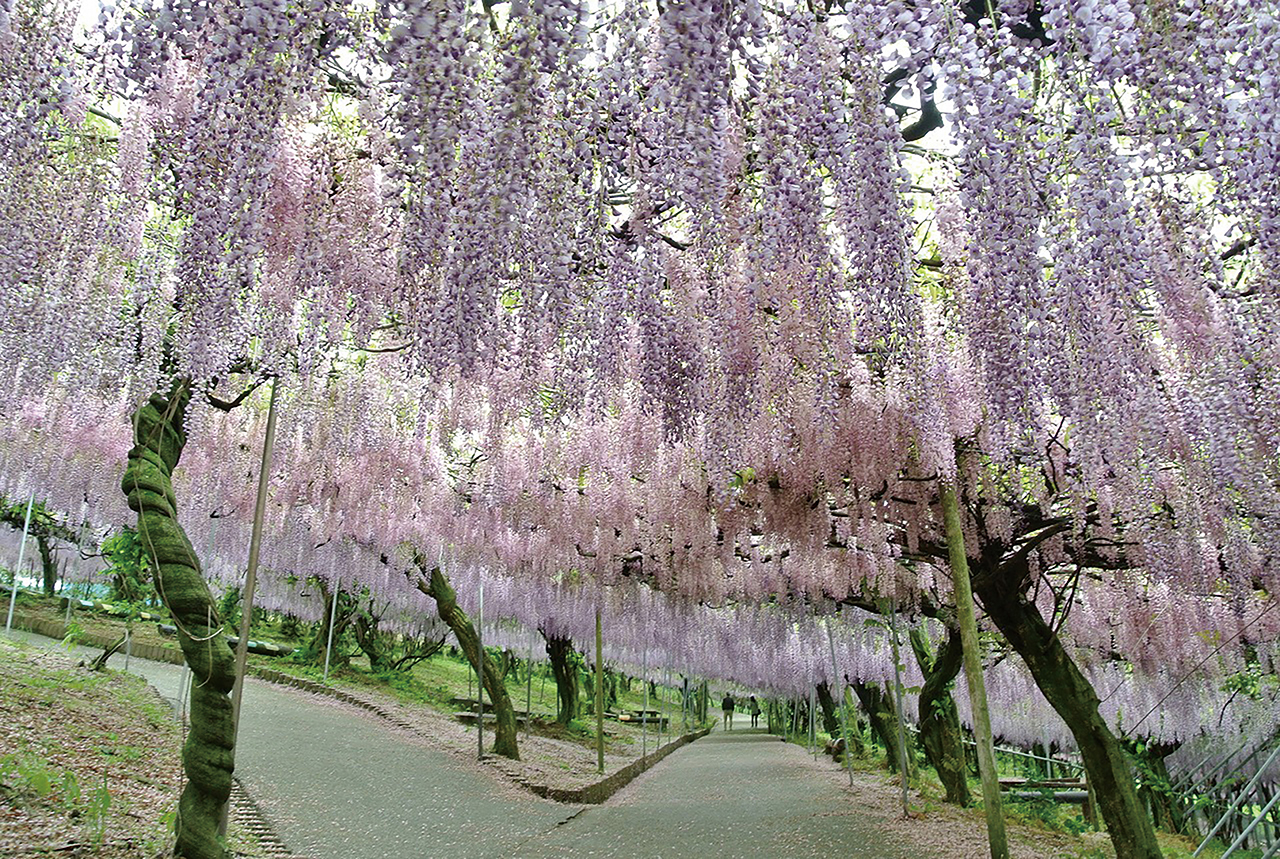 2400坪の藤棚に250本のフジが広がり、美しい花姿を観に遠方から訪れる人も多い、宇佐市の春の人気スポットです。白、ピンク、紫など見事なフジの花と甘い香り、新緑の茶園と新茶を煎じる芳ばしい香りは初夏への移ろいを楽しませてくれます。