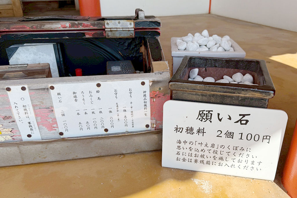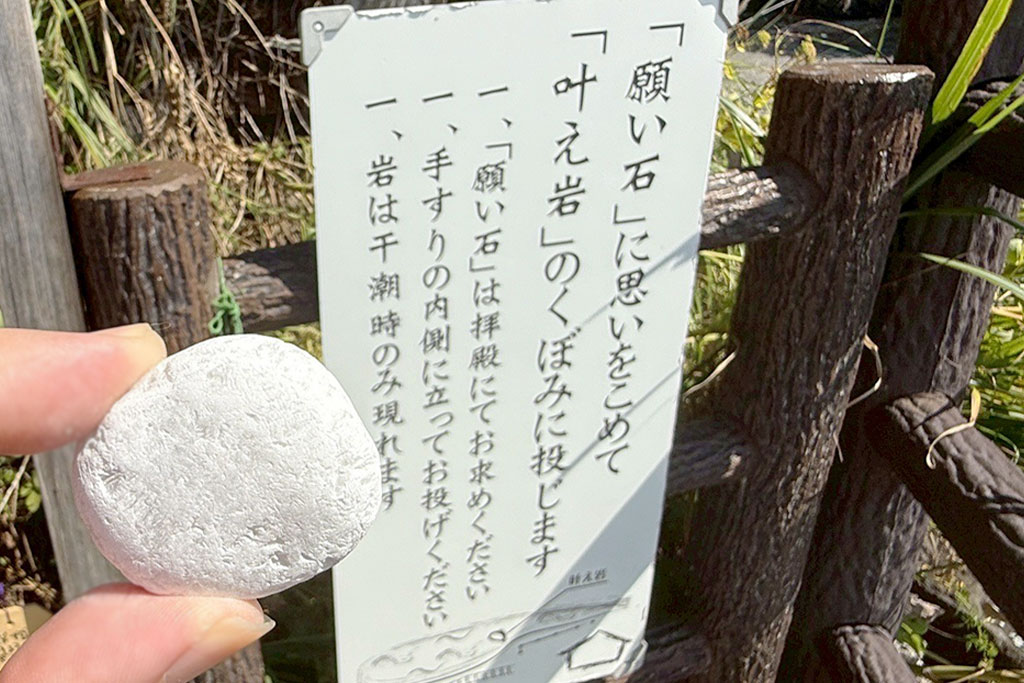 お祓いを受けた石に願いを込めて、海の中にあるハート形の「叶え岩」のくぼみに投げ入れると、願いが叶うと言われています。