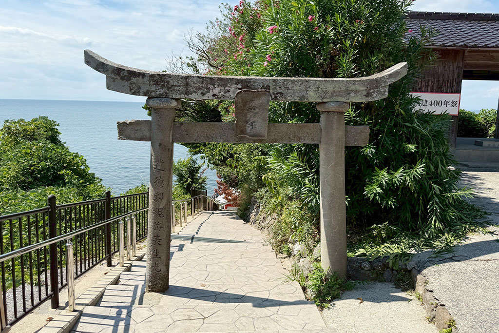 鳥居をくぐって少し下ると、視界が開けて海がドーンと広がる境内に出ます。潮の香りと波音が近く、参拝してるだけで気持ちが落ちつきます。