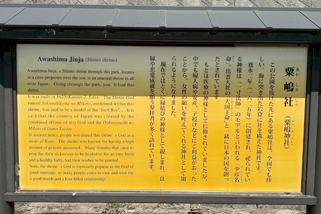 粟嶋社は海に突き出した岩窟に社が設けられている、全国的にも珍しい立地の神社。寛永2年(1625年)創建と伝えられ、祀られているのは小彦名命(すくなひこなのみこと)。古くは医療や安産の神として信仰され、現在は縁結びや良縁を願う人たちに親しまれています。