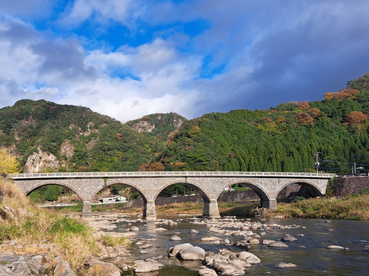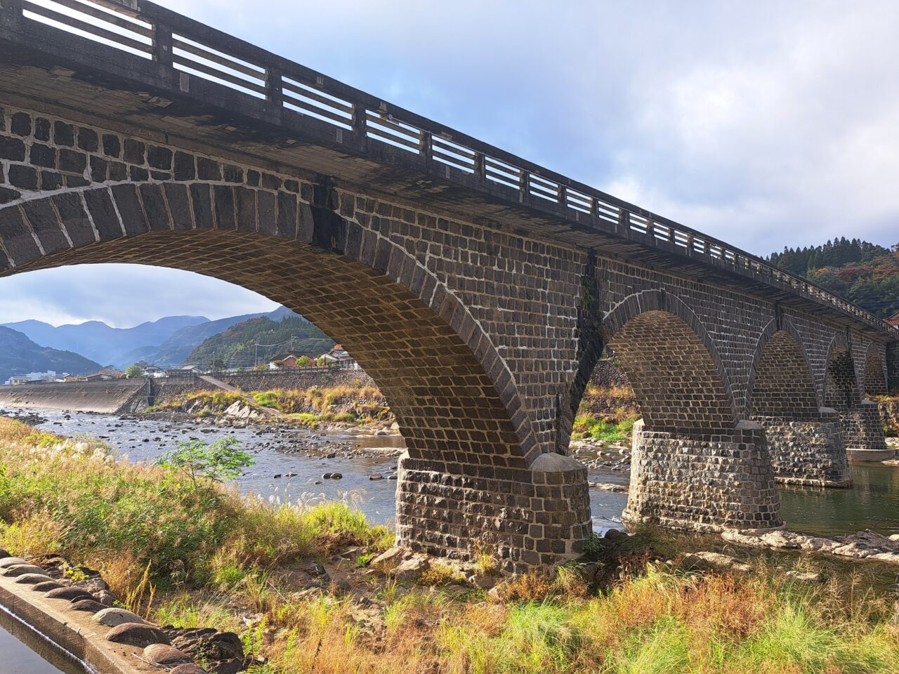 大正12年完成、5連アーチで、石橋としては全国4番目の長さを誇り、本耶馬渓町の「耶馬渓橋」「羅漢寺橋」とともに、「耶馬三橋」と呼ばれています。