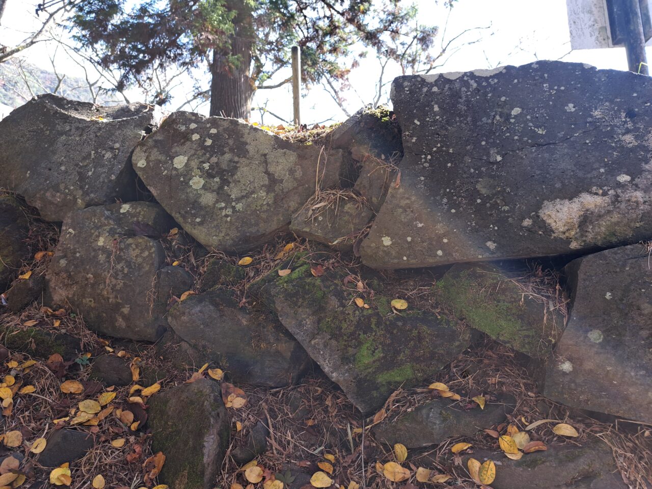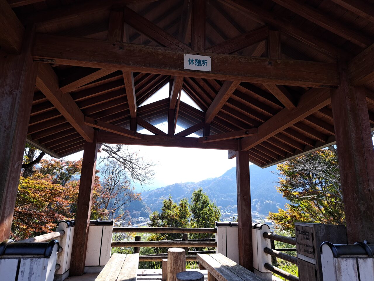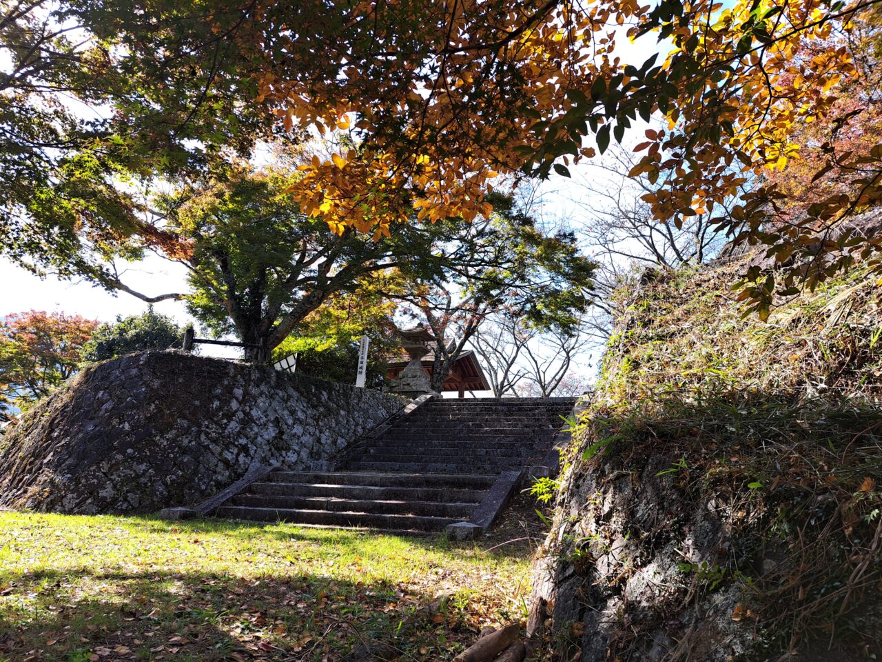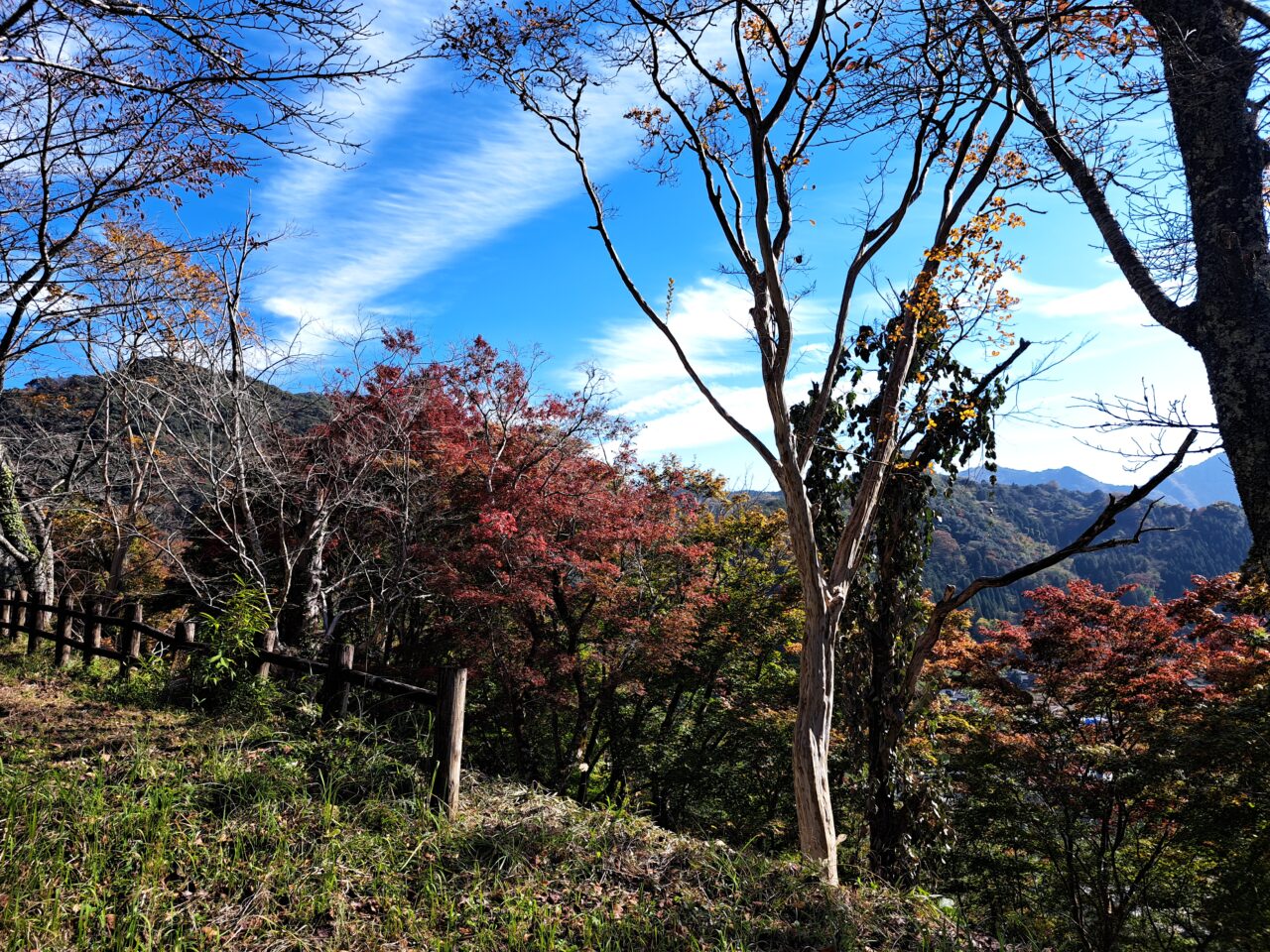 駐車場のむかって右の坂道から入る城跡公園の入り口は、獣害対策の門が閉まっていて入れないときもありますが、上の公園は整備されていて、眺めのよい休憩所もあります。(駐車場からここまで徒歩5分程度です)