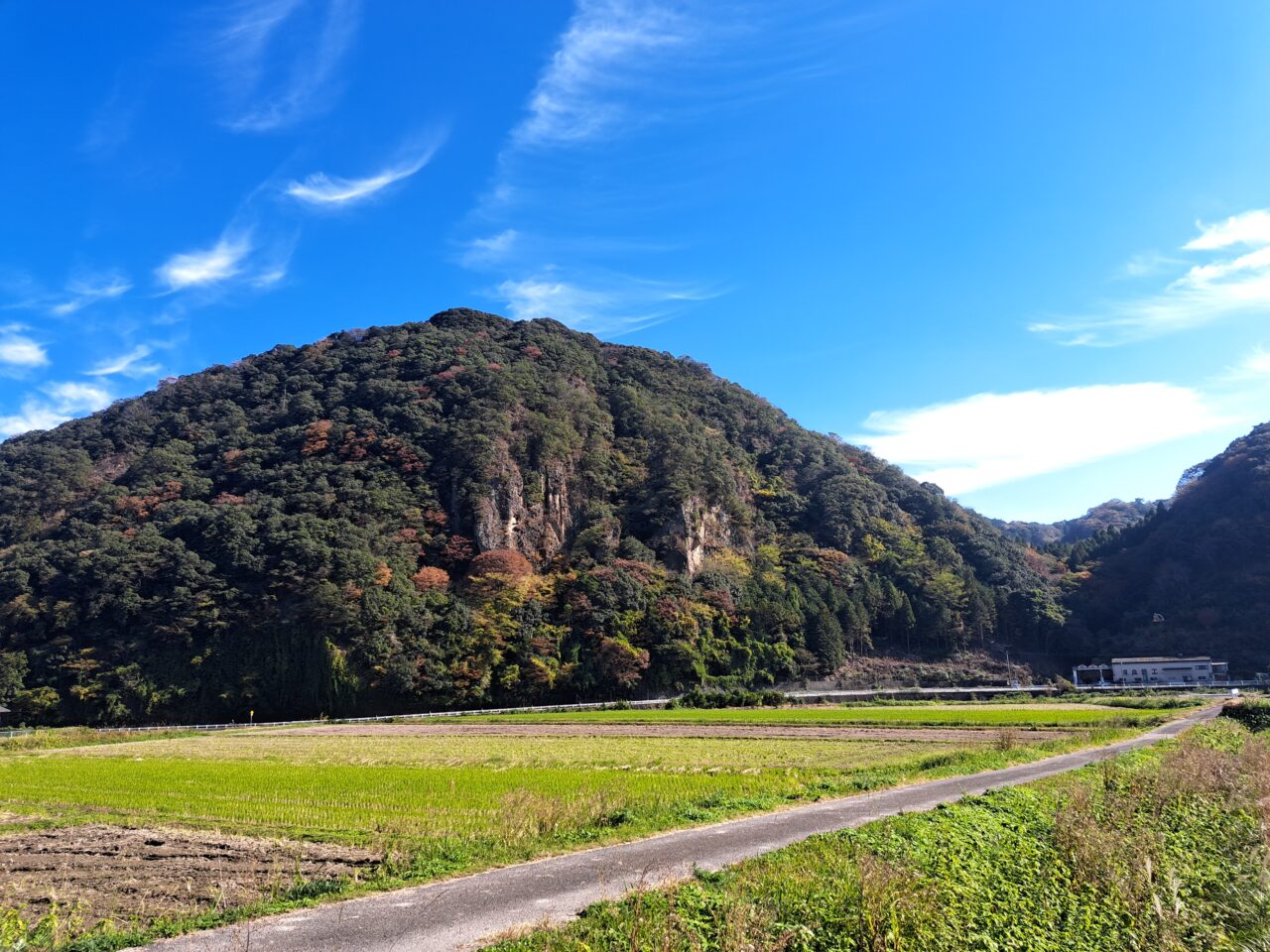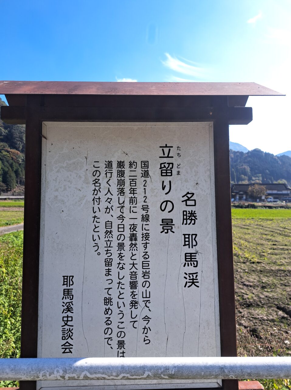 橋のところから見る景色もよいですが、本来の「立留りの景」は、この岩山を対岸から眺めた景色を指すので、対岸のメイプル耶馬サイクリングロード(日田往還)に看板があります。