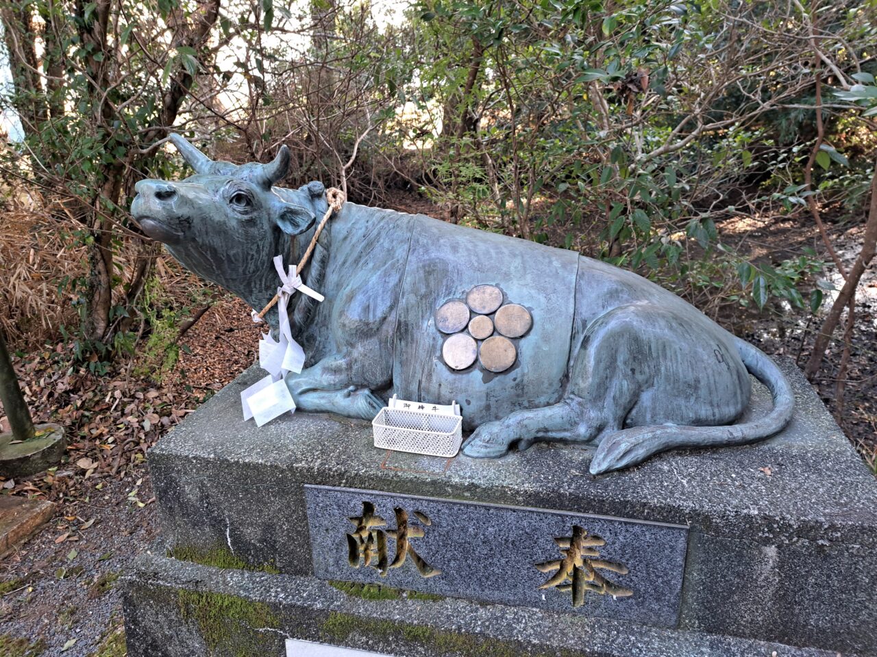 拝殿の前に牛の像があります。天神様のお使い『御神牛(撫で牛)』。御神牛の頭を撫でると知恵をさずかるとも言われ、大きい天満宮には御神牛の像があります。