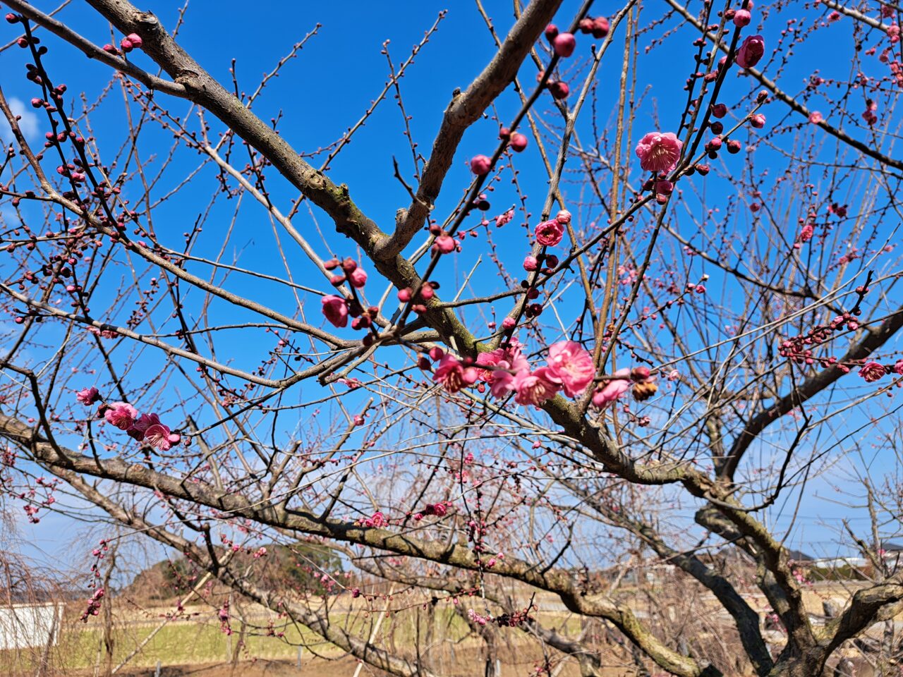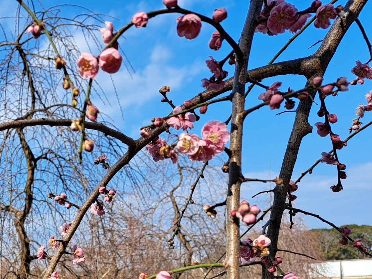 犬丸梅苑で特に多く華やかなのが、しだれ梅。2月1日時点では1本だけ咲き始めていましたが、他の木はまだでした。