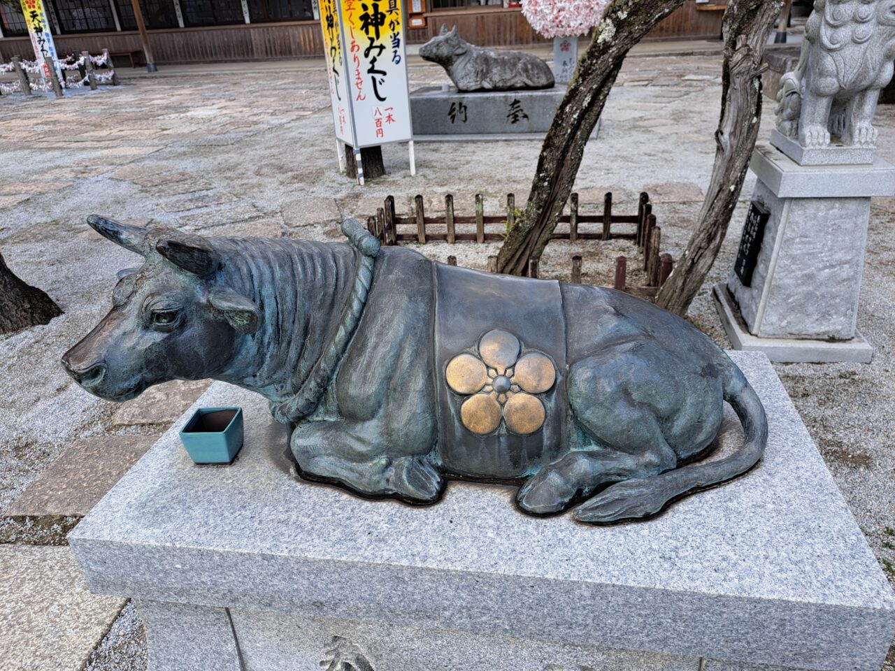 御神牛。道真公が亡くなられた際に牛車の牛が伏せたところに葬られたことから、天神様のお使いとされ、あの太宰府天満宮には11体もの御神牛像があるのだとか。綱敷天満宮でもあちこちに御神牛の像を見かけます。御神牛の頭を撫でると知恵を授かるという伝承もあり、頭を撫でていく参拝客も見受けられました。