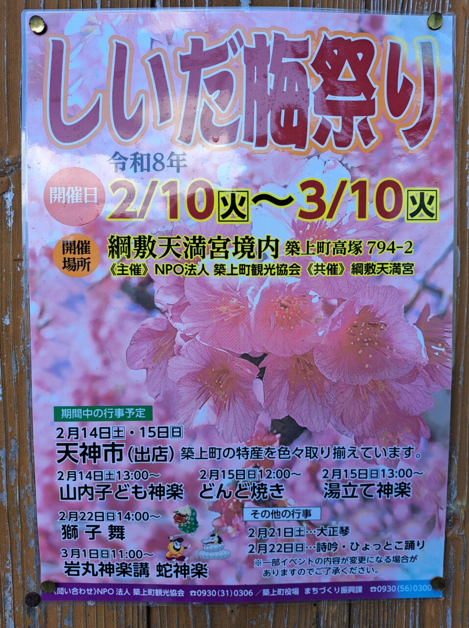 令和8年は2月10日〜3月10日が『しいだ梅祭り』となっており、出店やお神楽などイベントがあります。