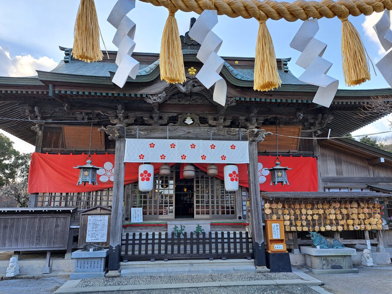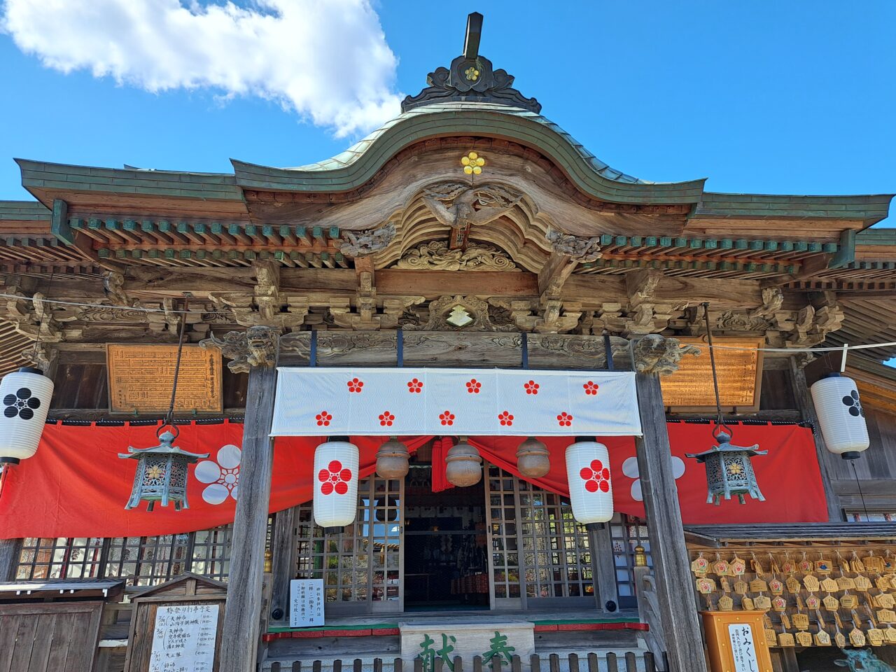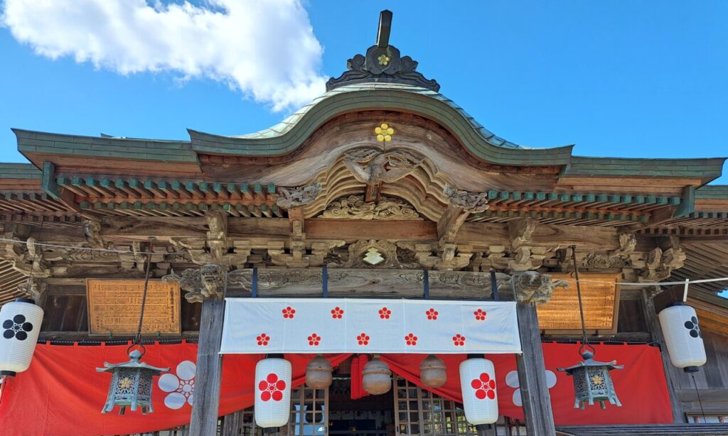 幕や提灯・灯籠などの後付けのものだけでなく、破風など社殿そのものにも梅があしらわれているのが特徴的です。