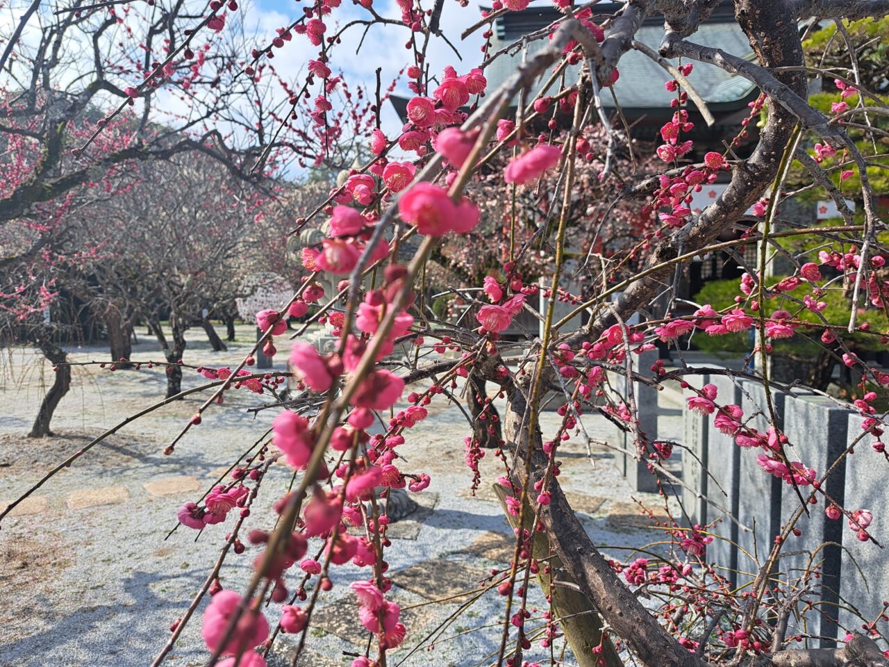 梅と社殿や鳥居などの組み合わせが優雅で日本の早春らしいです。