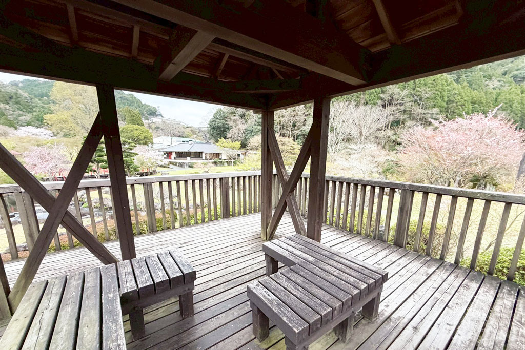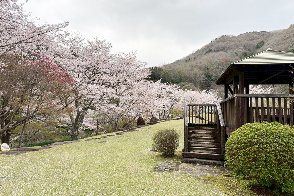 耶馬渓の自然に囲まれた中にある、落ち着いた雰囲気の花見スポット。庭園のように整備された園内では、池や石組みと桜の景色が楽しめ、ゆっくり散策しながら過ごせます。観光やドライブとあわせて立ち寄るのにもおすすめです。紅葉の季節にはライトアップも行われ、四季を通して楽しめます。