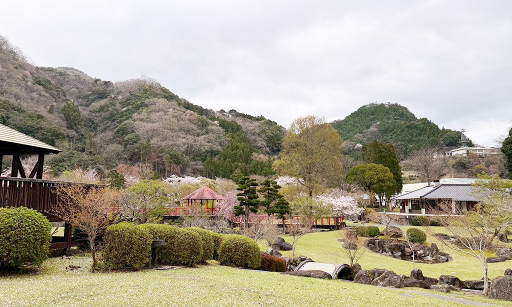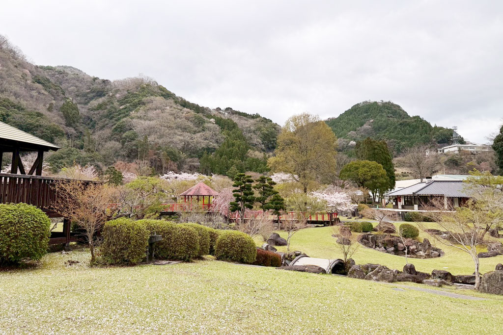 耶馬渓の自然に囲まれた中にある、落ち着いた雰囲気の花見スポット。庭園のように整備された園内では、池や石組みと桜の景色が楽しめ、ゆっくり散策しながら過ごせます。観光やドライブとあわせて立ち寄るのにもおすすめです。紅葉の季節にはライトアップも行われ、四季を通して楽しめます。
