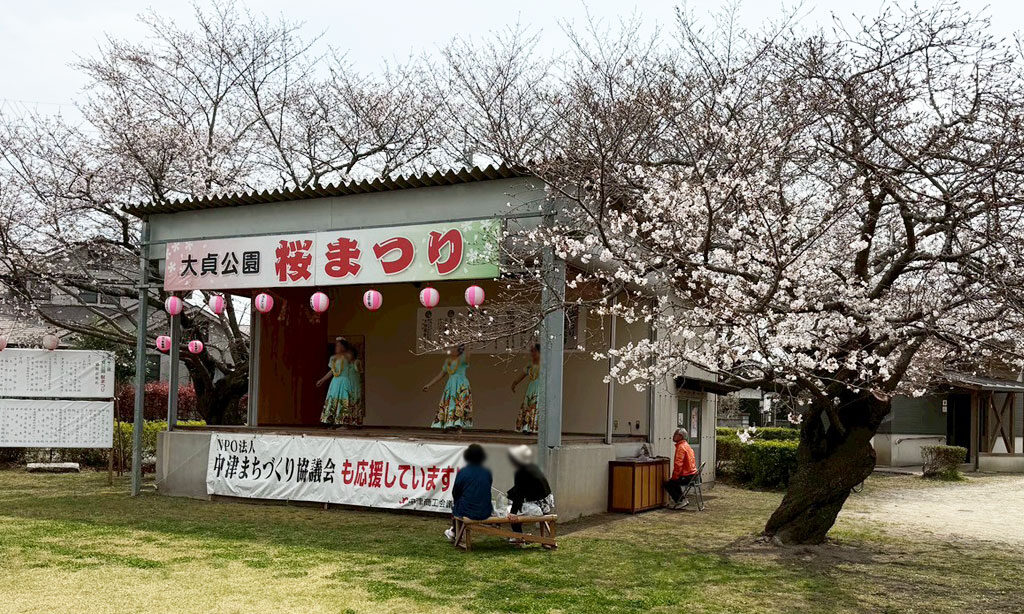 大貞公園といえば、周辺のダイハツ九州スポーツパークまで含めた広い範囲を紹介されますが、ここで紹介する大貞公園は、住宅街の中にある、昔から親しまれているお花見スポット。広々とした公園ではありませんが、桜の季節にはイベント会場が設けられ、出店や催しでにぎわいます。バーベキューもOKで、にぎやかな雰囲気の中で花見を楽しみたい人にぴったりです。
