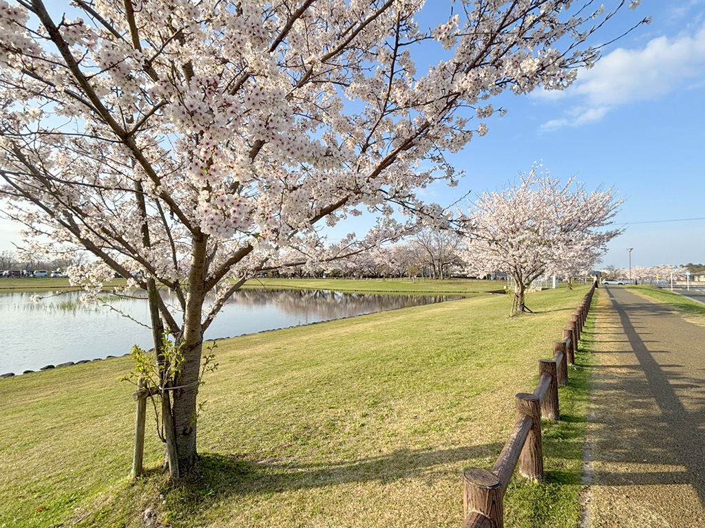 ダイハツ九州スポーツパーク大貞周辺は毎年たくさんの桜が咲き誇り、春の風物詩となっています。昼も夜も楽しめる春ならではの景色をご紹介!