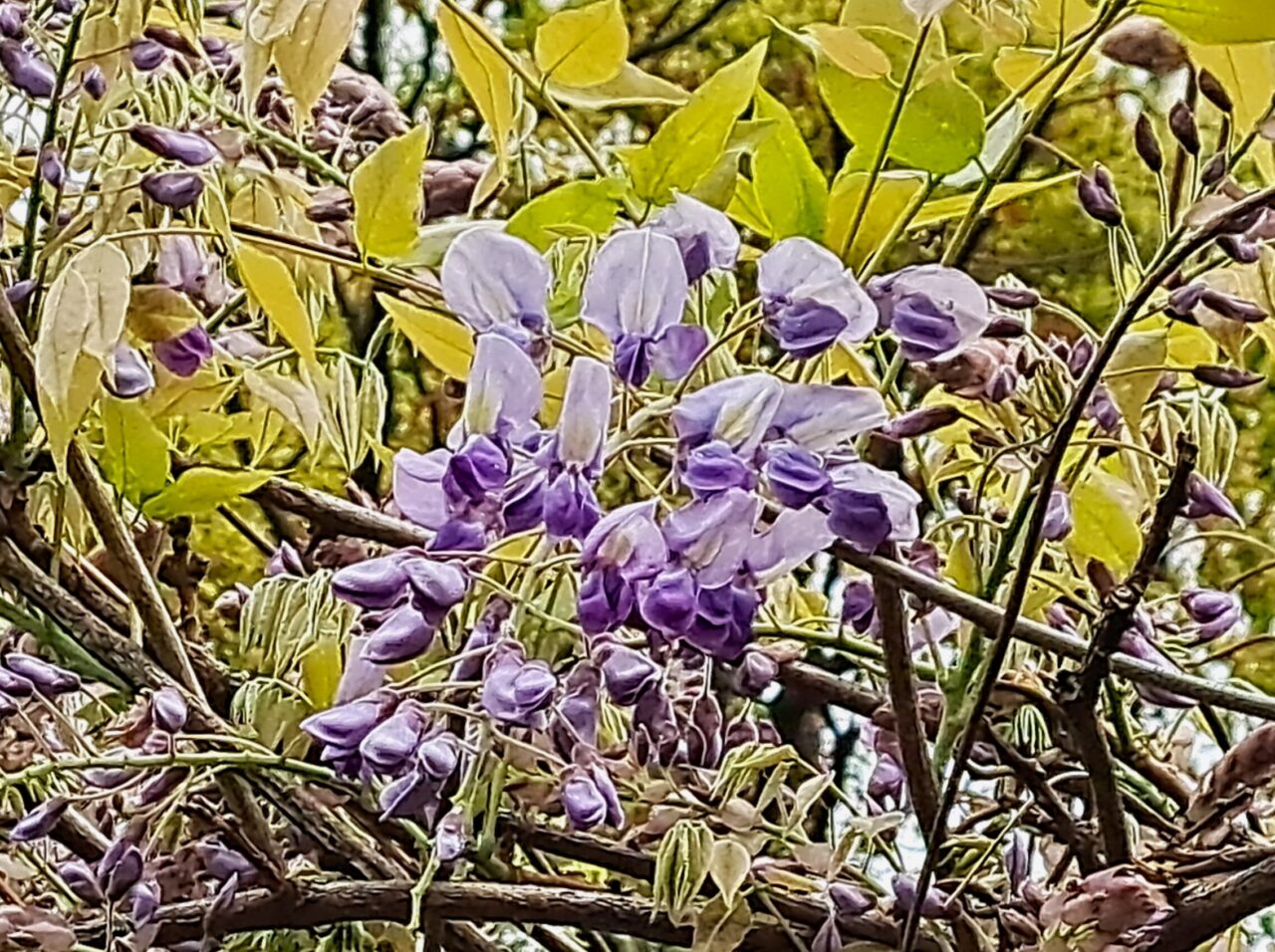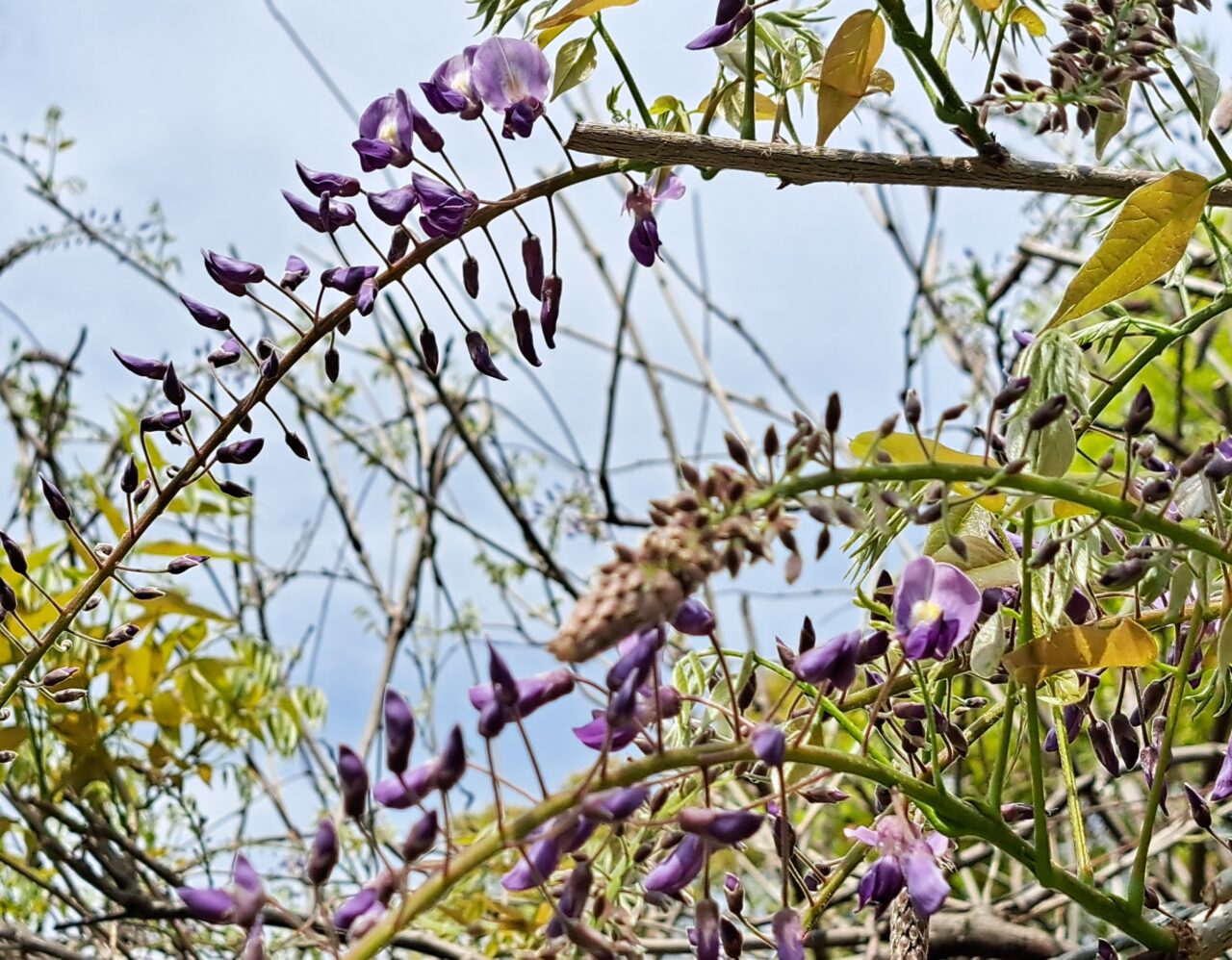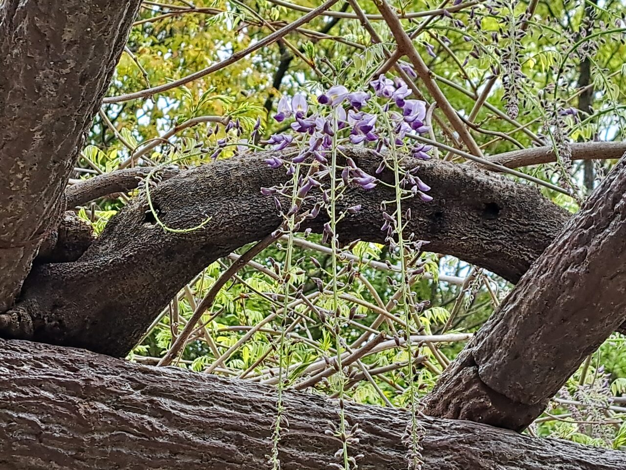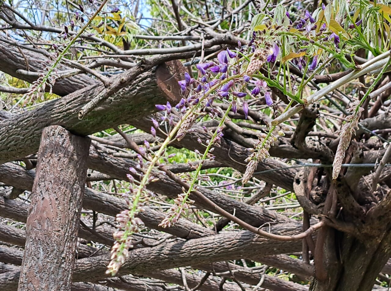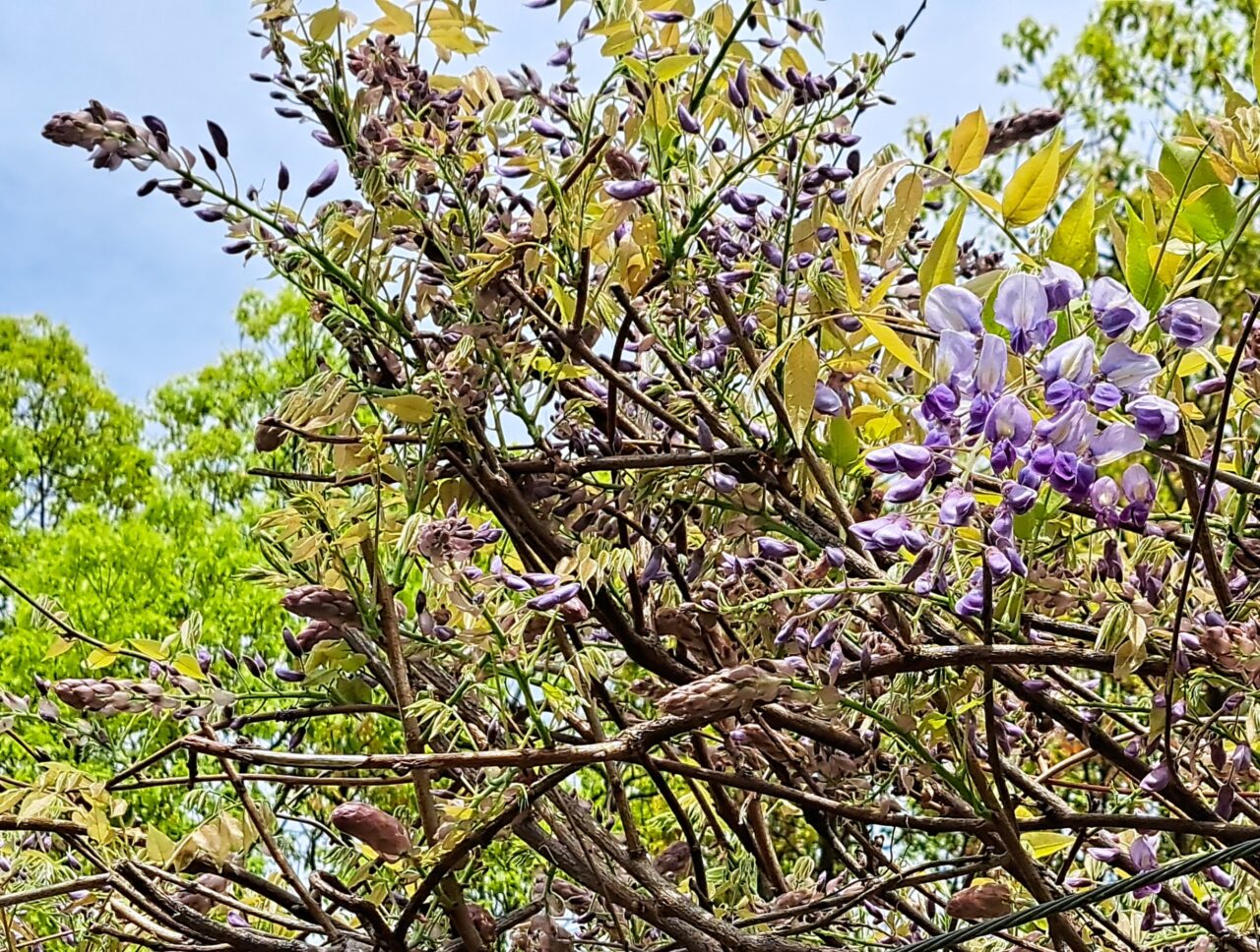 フジの花も毎年たくさん咲かせるのは難しいのでしょうか、つぼみがたくさんあるところと、少ないところが交互につづいているようです。また、花の房が長い木と短めの木がまじっているようでした。