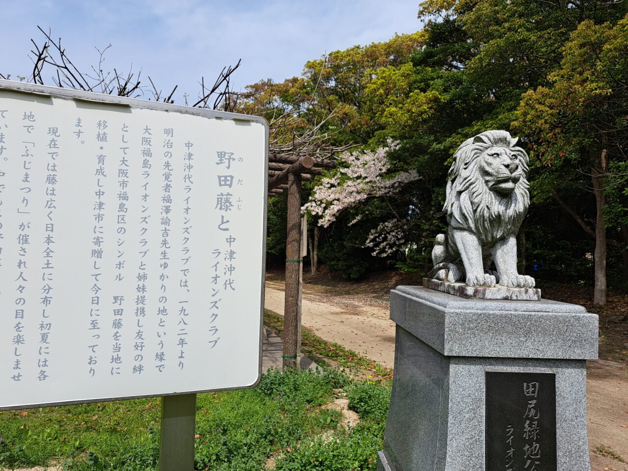 この公園のフジは、中津沖代ライオンズクラブさんの寄贈によるものなので、りっぱなライオンの像があります。