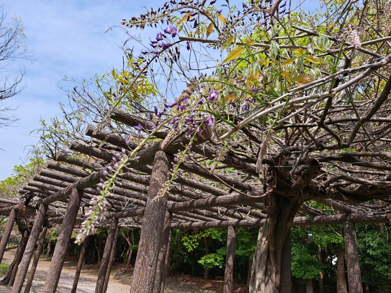 藤棚のある公園はめずらしくありませんが、こんなに長いものは見たことがありません。途切れ目はありますが、藤棚の先にまた藤棚が続きます。