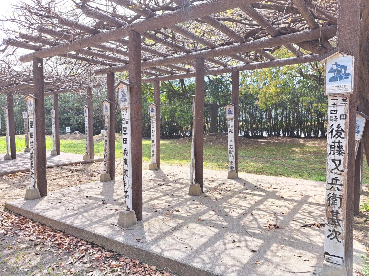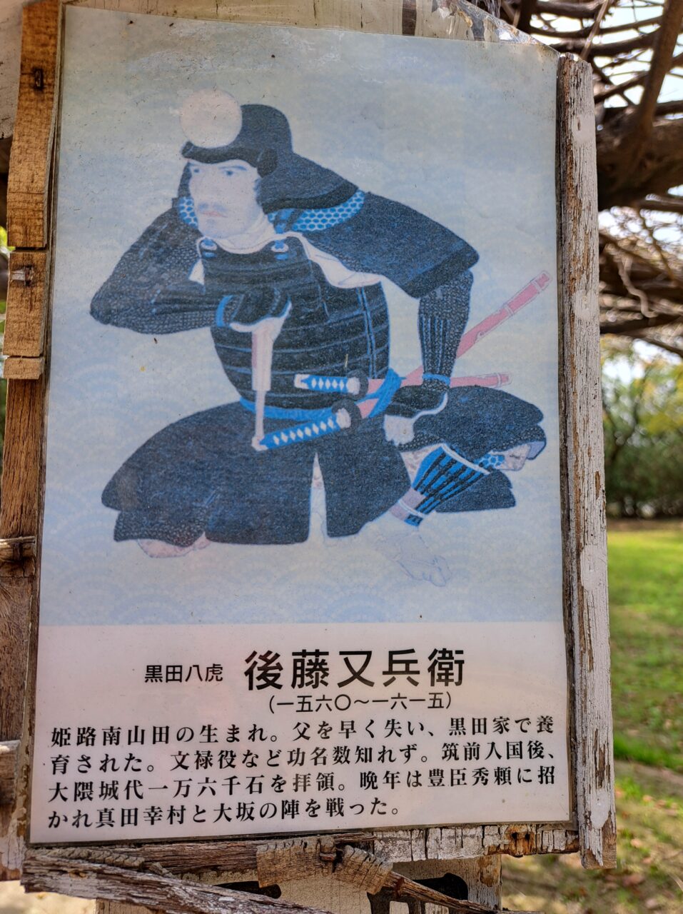 初代中津城主黒田官兵衛の家臣団として有名な「黒田二十四騎」の絵と説明文があります。なぜここにあるのかはわかりませんが、なんとなくフジの花には似合うような気もします。