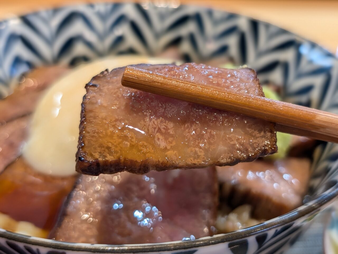 「黒毛和牛のどんぶり(2,200円)」を注文しました。味噌汁、小鉢、漬物がセットとなっています。黒毛和牛の希少部位を低温調理しているローストビーフが器いっぱいにごはんの上に乗っています。お肉の上には温泉たまごが乗っていて見た目からとても美しいどんぶりです。