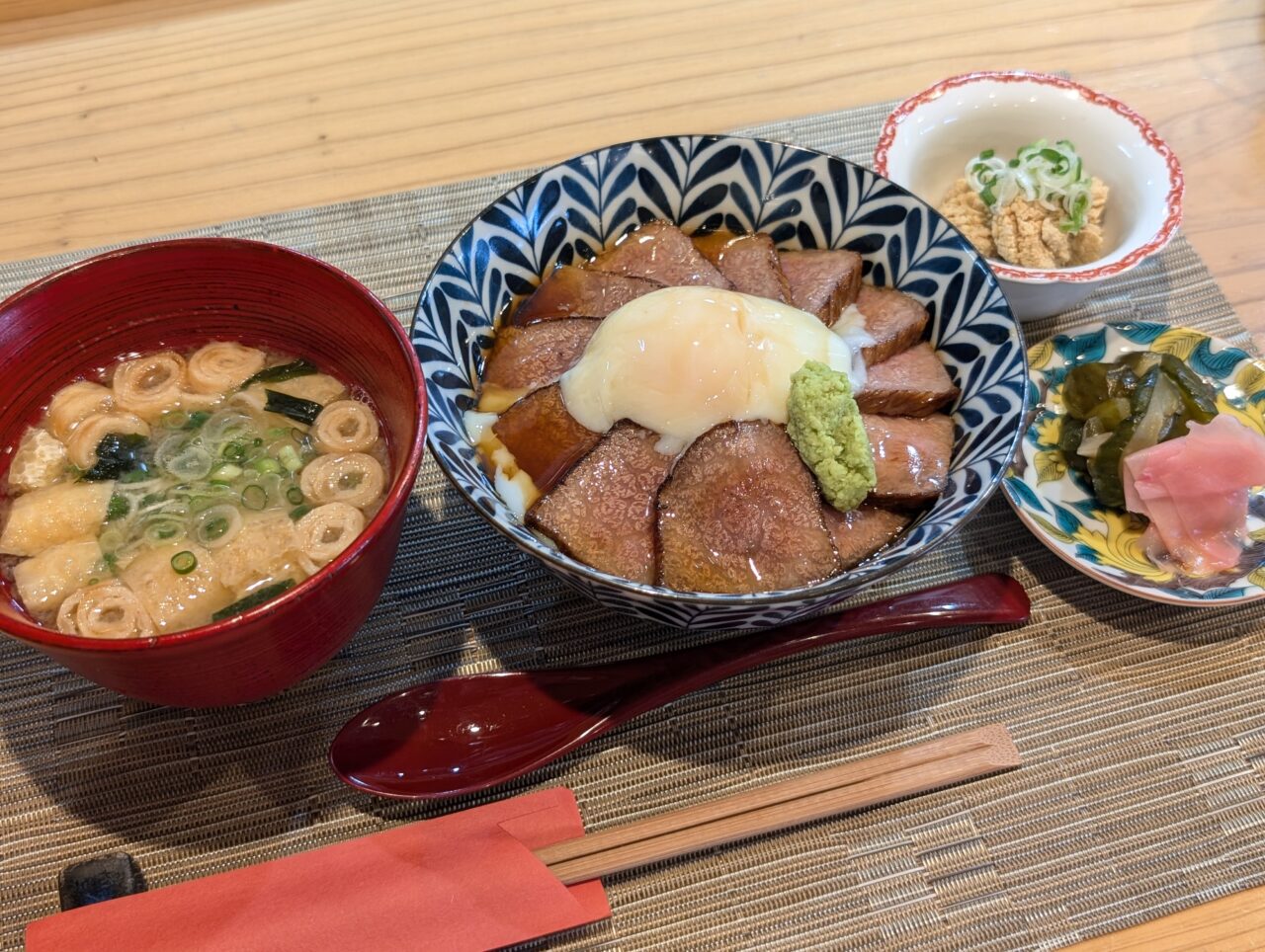 「黒毛和牛のどんぶり(2,200円)」を注文しました。味噌汁、小鉢、漬物がセットとなっています。黒毛和牛の希少部位を低温調理しているローストビーフが器いっぱいにごはんの上に乗っています。お肉の上には温泉たまごが乗っていて見た目からとても美しいどんぶりです。