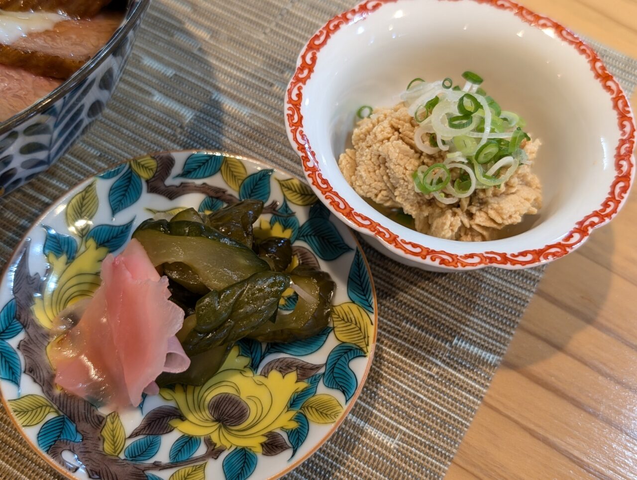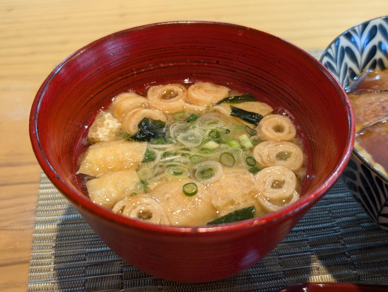 お漬物は大将の奥様の手作りです。きゅうりのお漬物は佃煮のような味付けでした。味噌汁は具だくさんでほっこりとする味で、どのお料理も大将と奥様のとても温かみのある人柄を感じました。宴会や法事などで席が満席のことが多いので予約をおすすめします。