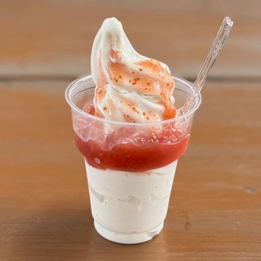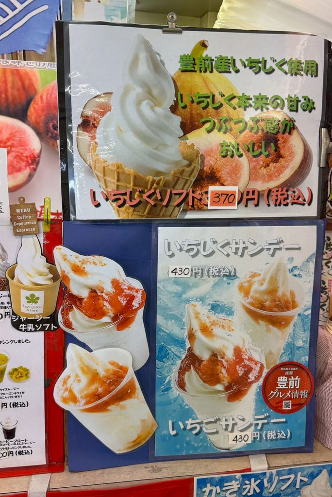 ソフトクリームには豊前産のいちじくが練り込まれていて、種のぷちぷち食感が楽しい仕上がり。さらに濃厚ないちじくソースがたっぷりかかっていて、甘酸っぱさと甘さとクリーミーさのバランスが絶妙です。