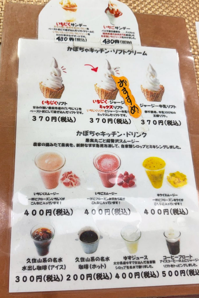 道の駅おこしかけの屋台村にある『かぼちゃキッチン』は、スイーツ好きには見逃せないスポット。地元・豊前産のいちじくを贅沢に使ったデザートなどが自慢で、いちじくソフトやサンデー、スムージーなどが並びます。老舗氷屋が手がけているため、夏にはかき氷、冬には肉まんなど温かいホットメニューも展開しており、四季折々の魅力を楽しめるお店です。
