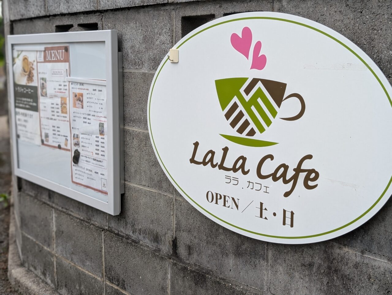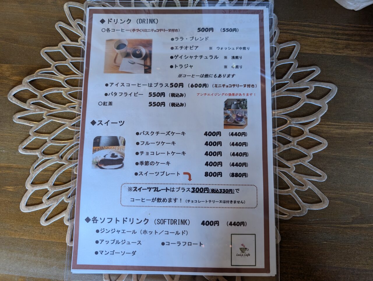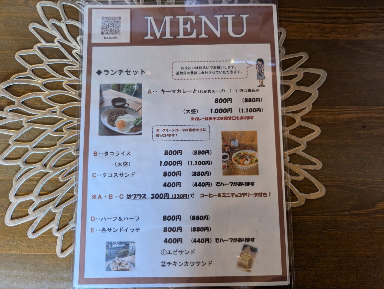 メニューはキーマカレー、タコライス、サンドイッチにケーキ、コーヒーとあります。