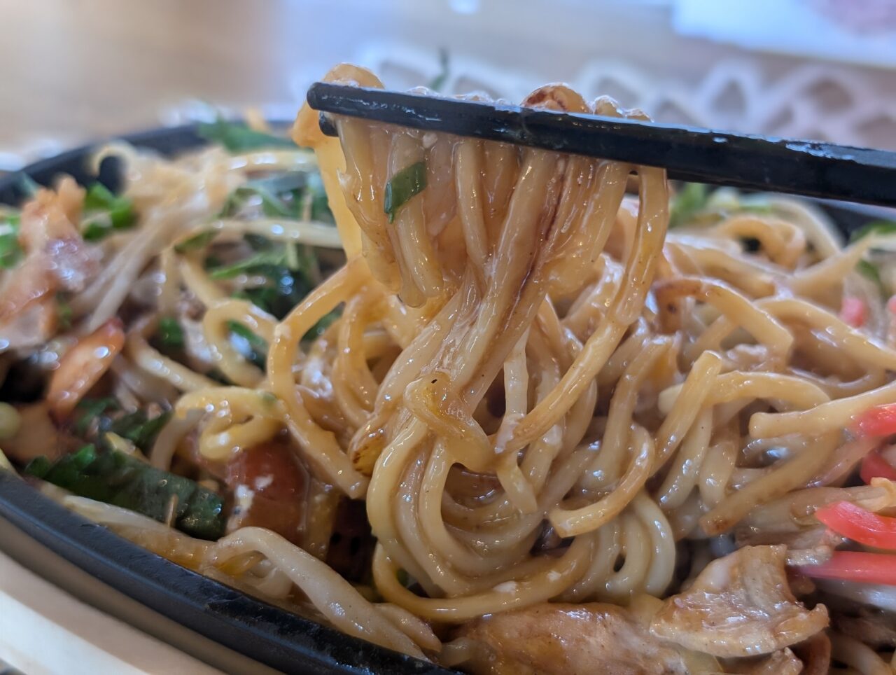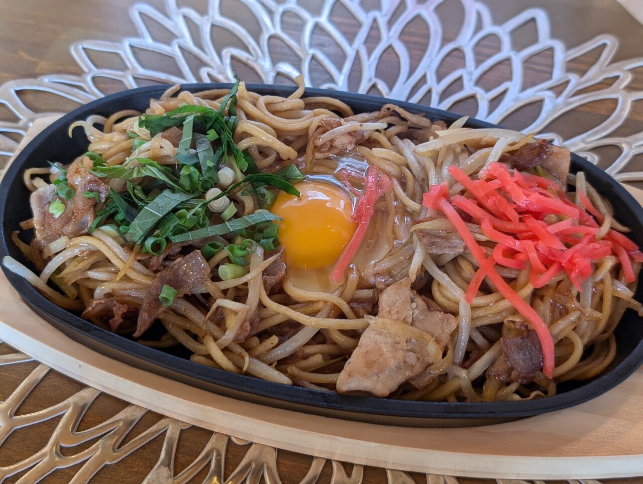 上に乗っている生卵を崩しながら食べます。鉄板が熱いので混ぜていると半熟な状態で麺と絡みます。鉄板の上に盛られた焼きそばは食べ終わるまで熱々です。