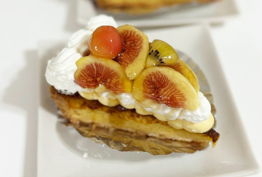 いちじくが堂々と主役を飾るタルト。いちじくの優しい甘みが、口の中でとろけるように広がります。さくらんぼのほんのりとした酸味や、キウイの爽やかな風味が絶妙なアクセントとなり、全体のバランスを引き締めています。