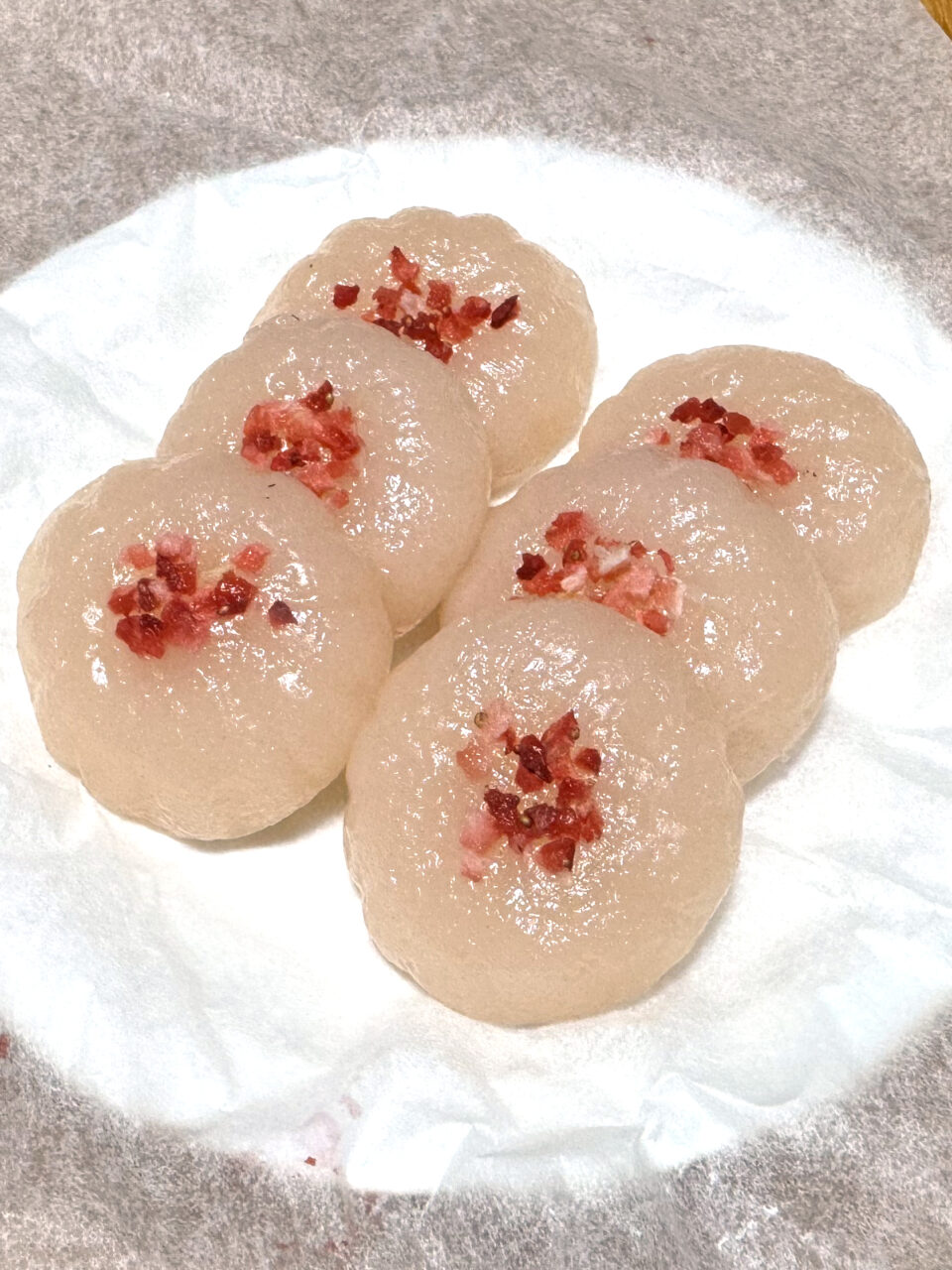 ほんのり桜色の生地に、刻んだドライストロベリーをのせ、口に入れると苺の香りがふわり。従来のケシの実とはひと味違う爽やかさがあります。