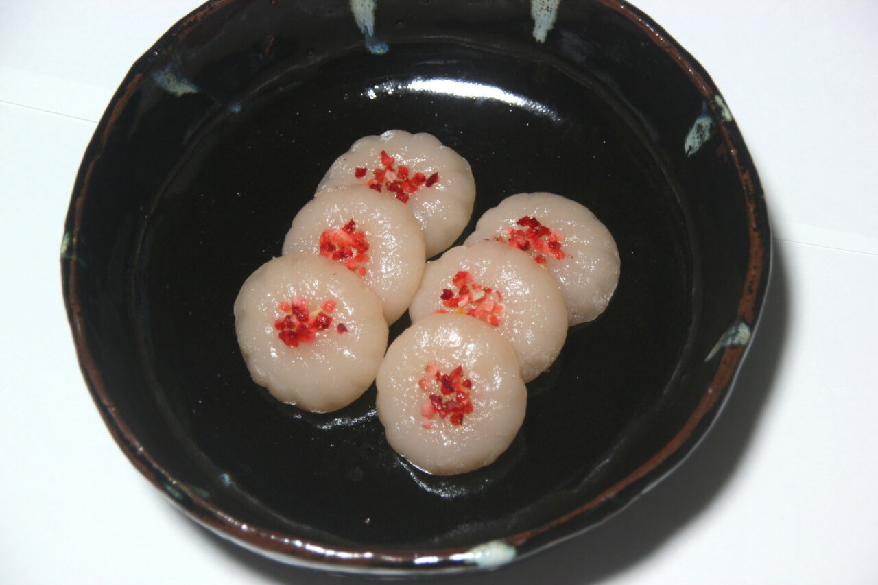 看板商品は、菊の花をかたどった全国でも珍しい「外郎饅頭」。もっちりとした食感に、上品な甘さとほんのり香るショウガの風味が特徴で、白と黒の2色を定番にしています。築100年を超える趣ある店内で、7代目・8代目が一つひとつ木型で丁寧に仕上げるその姿勢は、中津ならではの伝統そのもの。武将・黒田官兵衛を支えた栗山家の子孫が受け継ぐ、城下町ゆかりの逸品です。