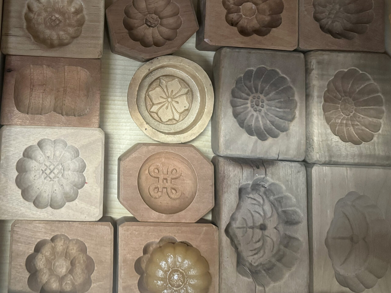 現在は7代目の栗山喜代子さんと8代目の英之さんがのれんを守っています。築100年を超える趣ある店舗です。一般的な棹型ではなく、花の形に木型で一つひとつ丁寧に打ち出すのが中津外郎の特徴であり伝統です。