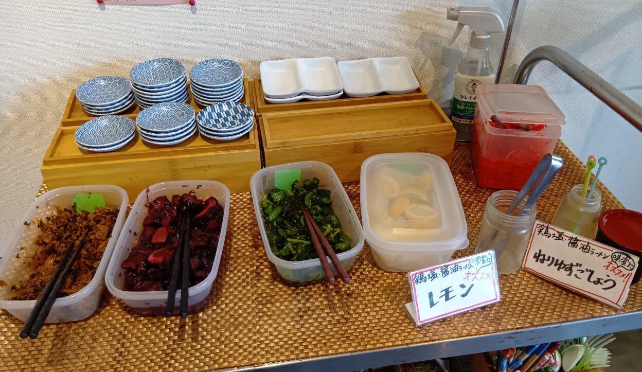 店内には無料のトッピングも用意されてあります。濃厚なスープの合間にさっぱりした味変を楽しみたい方や、ラーメンにお好みのトッピングを加えたい方におすすめです。
