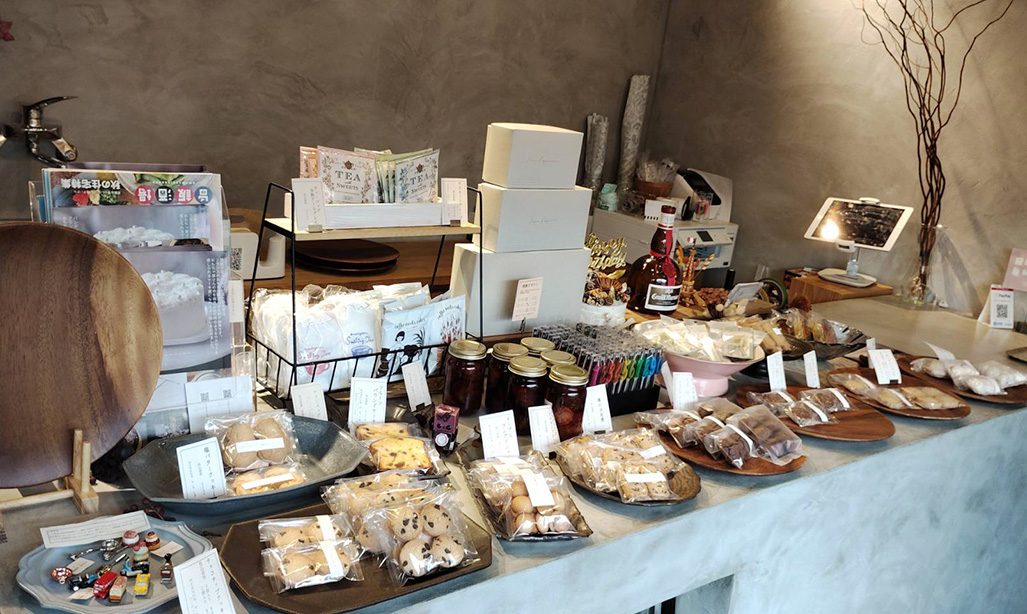 扉を開けるとふわっと甘い香りが広がり、ショーケースには季節のケーキや焼き菓子がずらりと並びます。