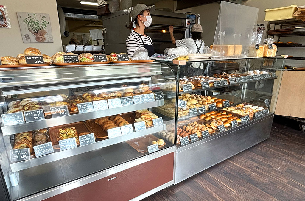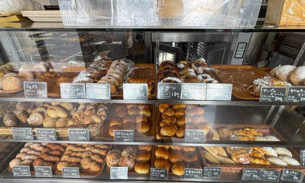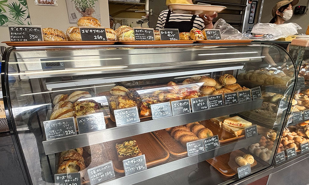 店内に入ると、ガラスケースの中に焼きたてのパンがずらりと並び、思わず目移りしてしまうほど。
