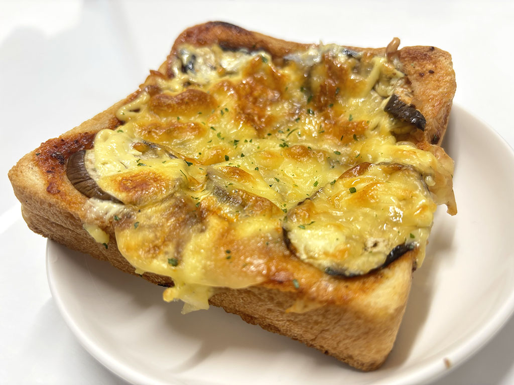 香ばしく焼き上げた厚切りトーストの上に、ミートソースジューシーなナスをたっぷりトッピング。