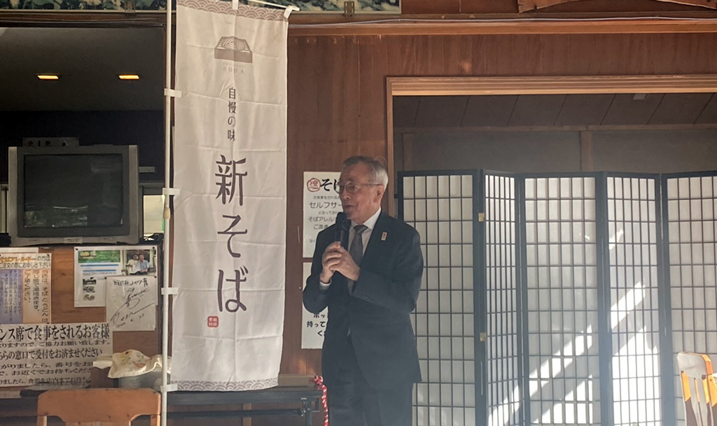 木の温もりを感じる会場内では、司会の進行のもと主催者挨拶・中津市長挨拶があり、その後、市長による「新そば解禁宣言」が行われると、いよいよ試食タイムへ。